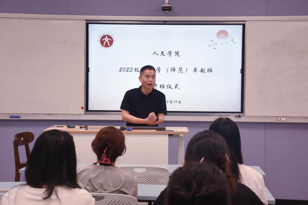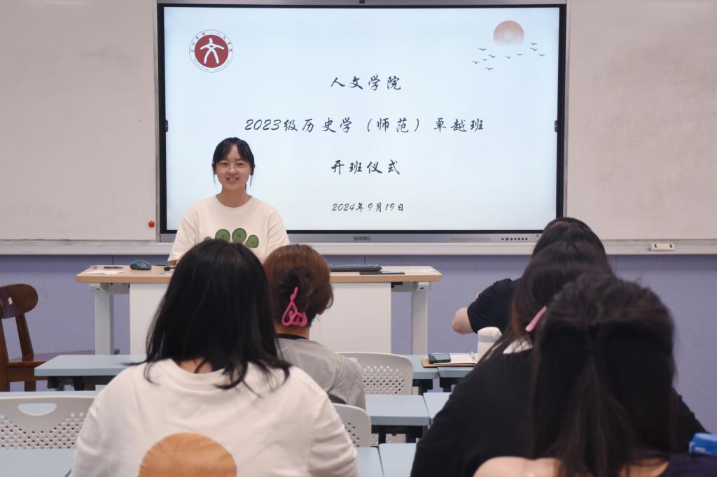 仪式伊始,娄欣星发表讲话,她首先恭喜十七位同学通过遴选成功入选历史卓越班。她表示历史卓越班顺应国务院新颁文件发展大势,期待同学们进入卓越班后可以实现教师实践技能的训练和提升,拥有更多元的职业发展规划。