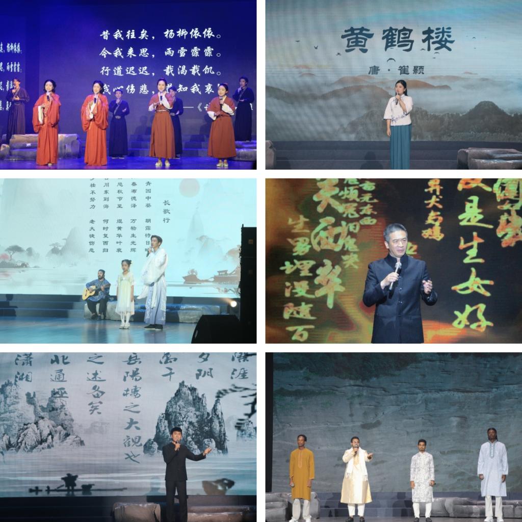 此次诵读会分为“经典传唱”和“青春礼赞”两大篇章。在“经典传唱”篇章中,风雅诵读社为大家带来了三首《诗经》名篇(《采薇》《伯兮》《君子于役》),表达了对和平的珍视和向往;陈苏敏同学的诗词小课堂带大家领略了《黄鹤楼》的千年古韵;在优美的吟唱声中,哲商小学林思言小朋友、留学生李小龙和风雅诵读社合作带来的《长歌行》给予了我们惜时奋进的力量;李鉴兵老师把《兵车行》朗诵得惊心动魄、荡气回肠;陈光明、李诚凯等留学生们带来的《蜀道难》把蜀道的雄奇惊险演绎得气势磅礴;张琳达校友朗诵的《岳阳楼记》情景交融,激发了场内观众心怀家国天下的热忱。