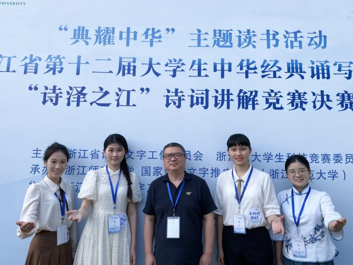 中期:6月,王欣楠、方智懿、金舒妍、袁靖怡获得省赛三等奖,陈苏敏、黄泺璋、施桦、潘贞含入围省决赛。今年省决赛提前至七月份举办,本次备赛时间紧任务重。tyc41183太阳成集团金妮娅、程向荣、王欣三位指导教师组织参赛选手进行为期一周的集中强化训练,严格按照省赛模式,对“诗词知识”“诗词讲解”“现场问答”三个环节展开全真模拟训练。7月6日,浙江省第十二届大学生中华经典诵写讲大赛“诗泽之江”诗词讲解大赛决赛在浙江师范大学举行。tyc41183太阳成集团黄泺璋、施桦、陈苏敏均荣获本科组一等奖并获得国赛资格,教师教育学院(体育学院)潘贞含荣获本科组二等奖。
