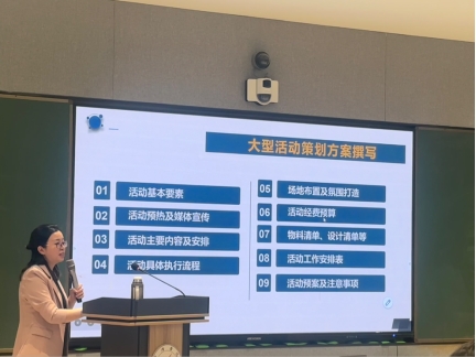 11月12日下午,传媒系副主任黄莉老师以实战案例为依托,对活动策划方案进行剖析。黄老师强调一份完整且完美的大型活动策划方案应涵盖活动基本要素、活动预热及媒体宣传、活动主要安排及内容、活动具体执行流程、场地布置和氛围打造、活动经费预算、物料清单、设计清单、活动工作安排表、活动预算及注意事项等。并且说明活动策划方案应当全面详细,直观明了,同时也应构思巧妙,不落俗套,让人眼前一新。