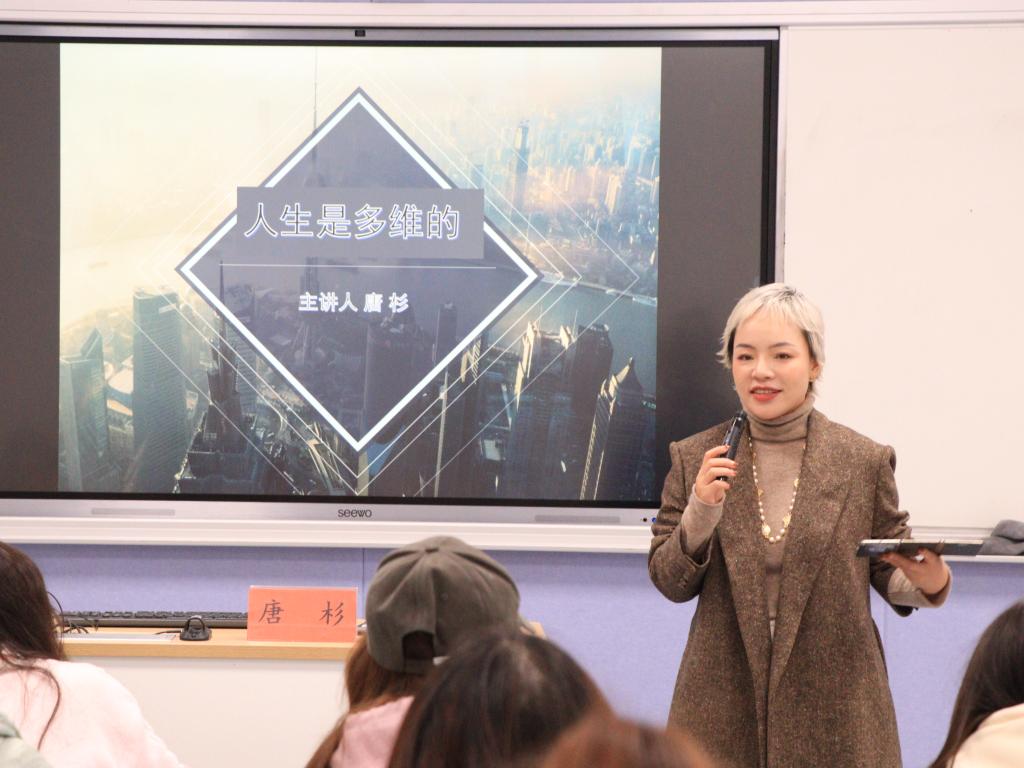 12月7日下午,tyc41183太阳成集团邀请了台州女企业家协会代表、2007届优秀校友唐杉在1105教室作“人生是多维的”主题讲座,为同学们带来了关于人生多维化视角的深刻思考。