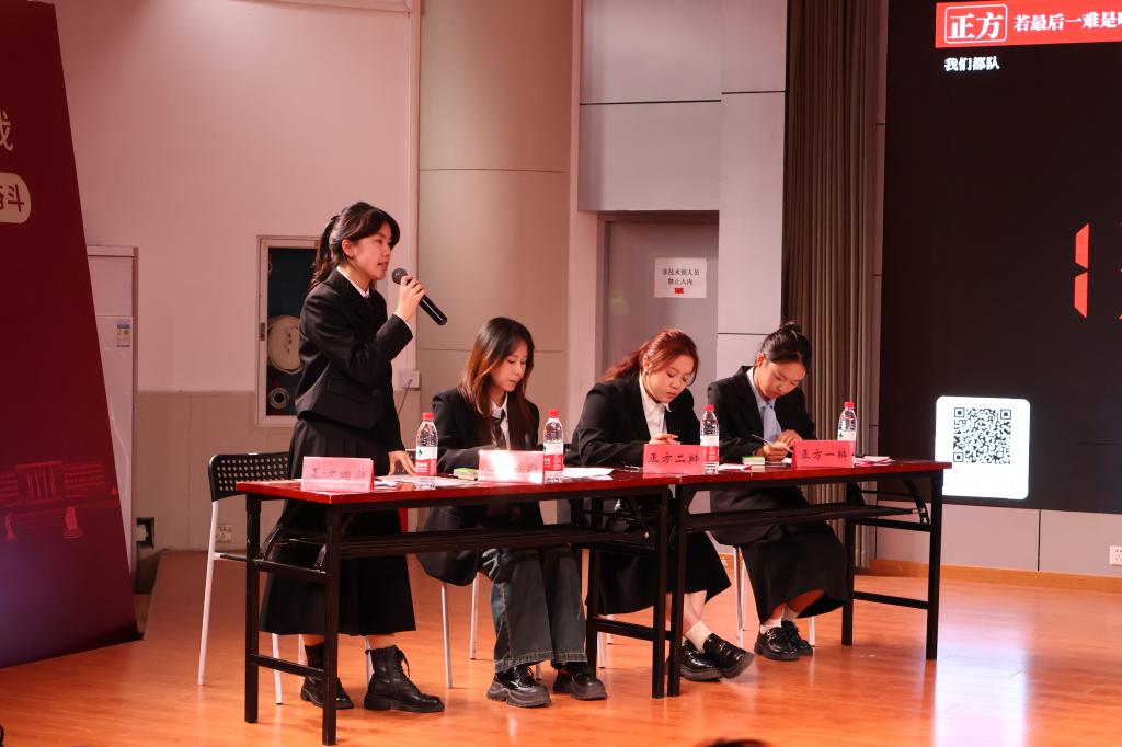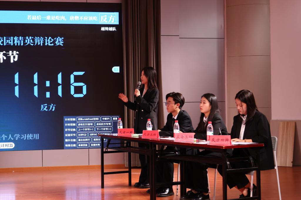 本次辩论赛自启动以来,吸引了全校广大师生的热情参与。经过一个月的激烈比拼,四支精英队伍、16名佼佼者脱颖而出,晋级决赛。决赛围绕“:若最后一难是吃肉,“唐僧应/不应该吃””及“当今中国,拐卖妇女儿童应该/不应该“买卖同罪””两大辩题展开,分为上下两场进行。辩手们各抒己见,言辞犀利,逻辑严密,为现场观众呈现了一场场精彩绝伦的辩论盛宴。在快节奏、高强度的交锋中,辩手们展现出了卓越的辩论技巧与深厚的文化底蕴,每一次思想的碰撞都闪耀着智慧的火花,让在场观众深受启发。