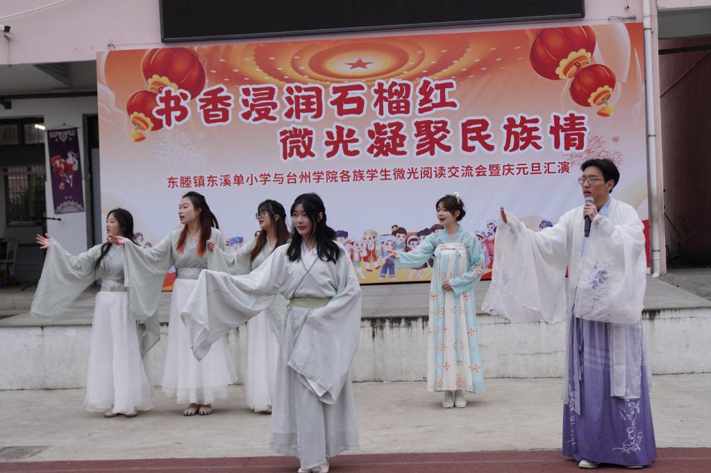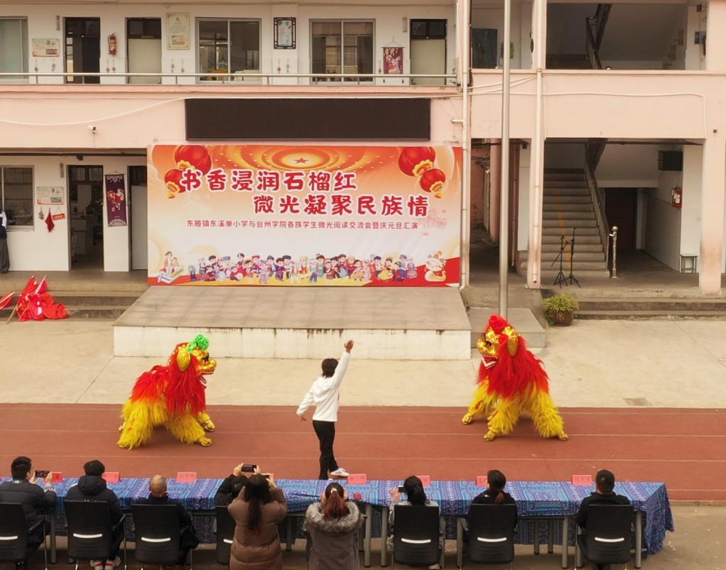 为铸牢中华民族共同体意识,弘扬中华民族优秀传统文化,12月27日下午,“书香浸润石榴红 微光凝聚民族情”临海市东塍镇东溪单小学与太阳成集团tyc41183各族学生微光阅读交流会暨元旦汇演正式拉开帷幕。tyc41183太阳成集团党委副书记林军辉,tyc41183太阳成集团教师、文化特派员赵鑫,tyc41183太阳成集团“雯”化育人工作室高晗雯等老师出席了本次活动。