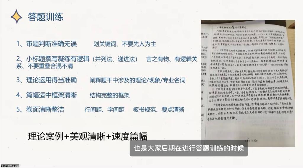 此外,张珂强调既要熟记参考书知识点,也要构建个人案例库和专题库。她建议将公众号优质内容、热点案例等分类整理,以便复习。中后期备考时,需深入挖掘真题,同时关注导师论文。若时间有限,可通过公众号获取精简重点。她还提到,背诵要注重方法,输出能力则依赖个人的练习。背书时,应先圈出关键点详细记忆,再抓核心用自己的话复述,多加训练。答题时,要规范格式,巧用小标题,使作答更加出彩。