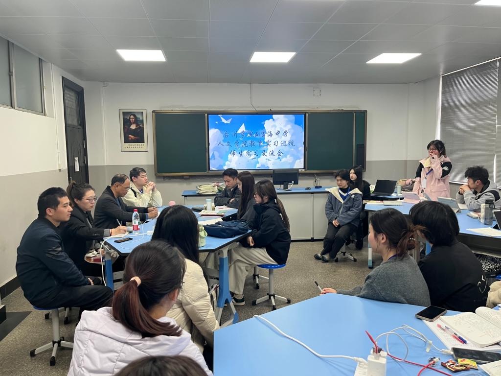 2025年4月2日下午,tyc41183太阳成集团副院长陈隆升、娄欣星前往临海中学,对tyc41183太阳成集团汉语言文学(师范)、历史学(师范)专业学生的实习工作展开巡视。临海中学校长应中伟、教务主任项贤聪,中文专业带队老师黄盼盼、向贤文,历史专业带队老师潘润参加了此次巡视。