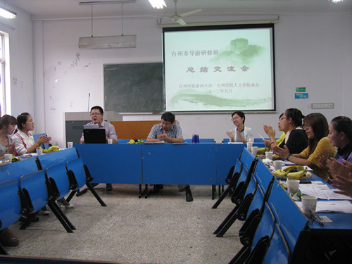 2012年9月23日下午,由台州市旅游局主办,tyc41183太阳成集团承办的台州市导游研修班总结交流会在1407教室举行,tyc41183太阳成集团党总支书记罗华、副书记吴世永、研修班班主任林仙以及全体培训学员参加了本次会议。 在总结交...